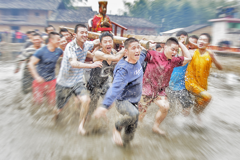 抬神像的汉子们你追我赶,时而健步如飞,时而故意放慢脚步,等后面的人追上来,便猛地转身,将手中的泥巴甩向对方。泥巴在空中划出一道道弧线,落在对方的身上、脸上,惹得围观的人群阵阵哄笑。被甩中的人也不恼,反而更加起劲地追赶起来。田里的水花、泥浆此起彼伏,在阳光下折射出七彩的光芒。