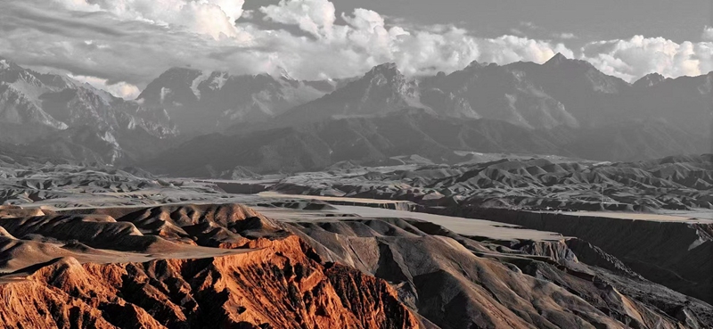 层峦叠嶂入云间,赤壤苍茫映日边