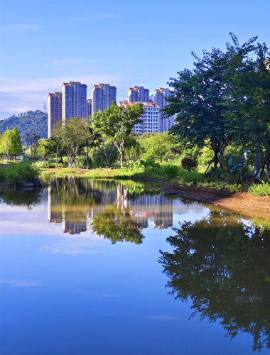 碧水如镜映天悠,楼影林光入画游