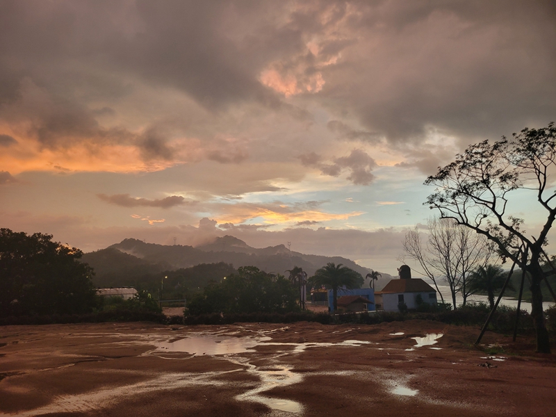 暮色漫染天际,厚重云层裹着橙金霞光,洒向远山与村落。地面水洼如镜,映着朦胧云影,小屋静静伫立,树木疏朗错落,山水交融间,藏着风雨后的温柔与宁静,似一幅晕染开的水墨长卷,诉说黄昏独有的诗意。