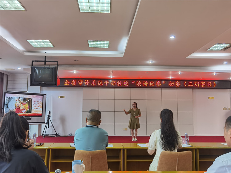 在“能说”的演讲竞赛中,明溪审计干部以“八闽聚力话审计热血春秋铸忠诚”为主题,以“二十大迎来新时代、携手奋进新征程”为内容,讲述了明溪县审计局全面贯彻落实党的二十大精神,以审计精神立身,以创新规范立业,以自身建设立信,激励明溪审计干部队伍敢为敢闯敢干敢首创,切实把党的二十大重大决策部署和省、市、县委工作要求转化为审计融入中国式现代化进程的具体行动,为奋力谱写全面建设社会主义现代化国家福建篇章提供高质量的审计服务保障。图为明溪审计干部演讲比赛现场。(明溪县审计局吴燕红 供稿)