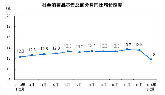 2014年1-2月份,社会消费品零售总额42281亿元,同比名义增长11.8%(扣除价格因素实际增长10.8%,以下除特殊说明外均为名义增长)。其中,限额以上单位消费品零售额20133亿元,增长9.5%。