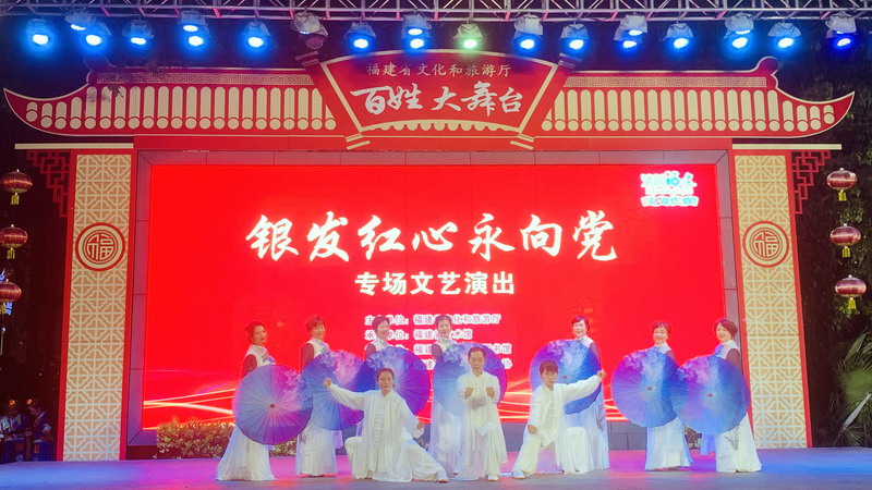 近期,桃花族论坛 老干部健身队参加了由福建省文化和旅游厅主办的百姓大舞台——“银发红心永向党”专场文艺汇演。队员们表演的太极《武魂神韵》刚柔并济,精彩纷呈,队员们在舞台上尽情讴歌党的丰功伟绩,深情表达对党的深情和永远听党话跟党走的决心。 图为活动现场(厅人事处 供稿)