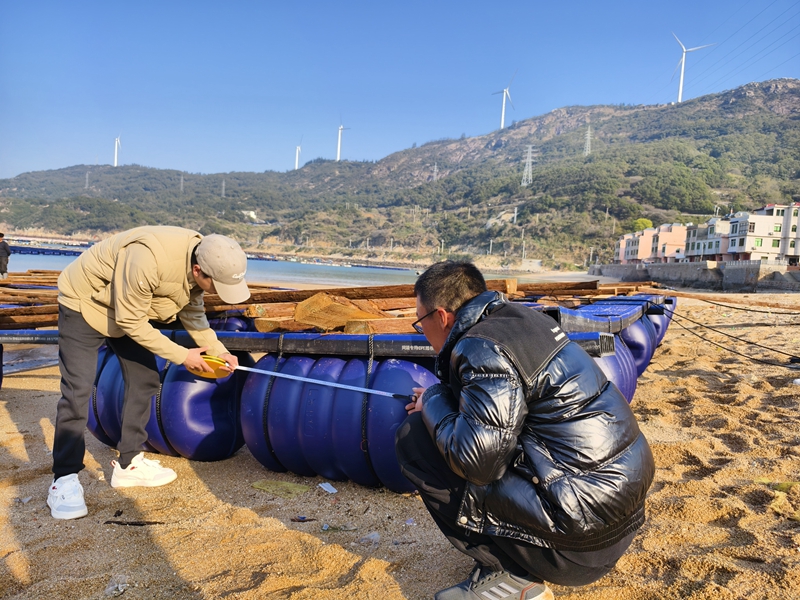 近日,福州市审计局在开展美丽海湾保护与建设情况专项审计调查中,关注海上养殖转型升级项目的推进情况,重点检查乡镇是否完成新建塑胶渔排任务,项目的申报、验收是否符合海上养殖转型升级质量监管指南要求,以推动绿色生态养殖模式的发展,提升海域的生态承载力。图为审计人员在测量新建板式塑胶渔排的直径和长度。(福州市审计局 供稿)